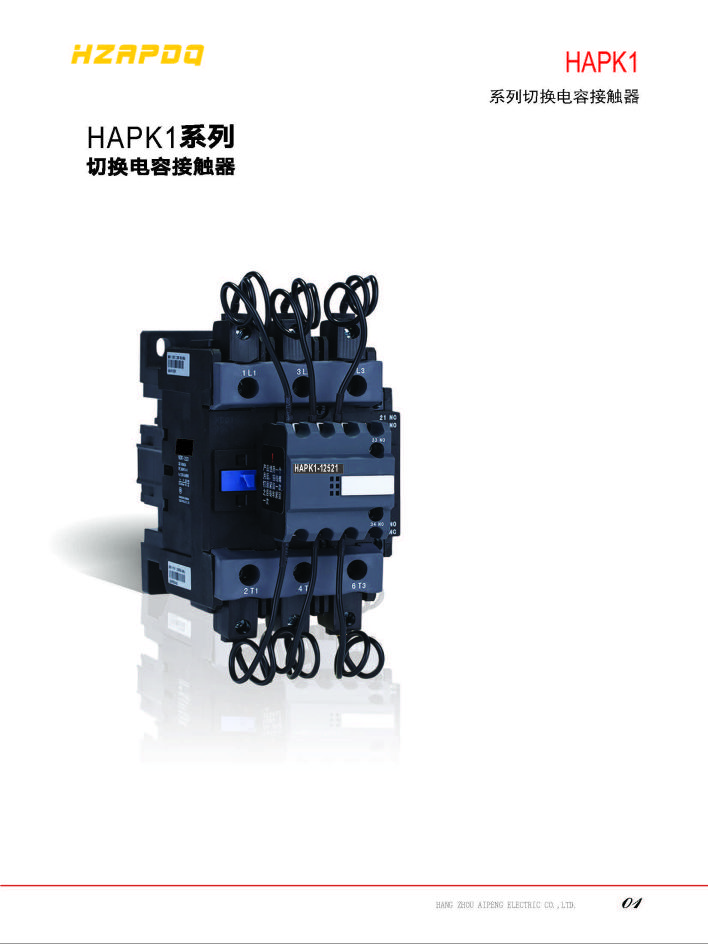 HAPK1系列切換電容接觸器(以下簡稱接觸器)為交流50Hz(或60Hz),額定絕緣電壓為690V,在AC-6b使用類別下,額定工作電壓為400V時額定工作電流至87A,廣泛用于低壓無功補(bǔ)償設(shè)備中,通斷電容器組。接觸器附有抑制浪涌裝置,能有效地減少合間涌流對電容器組的沖擊和降低過電壓
